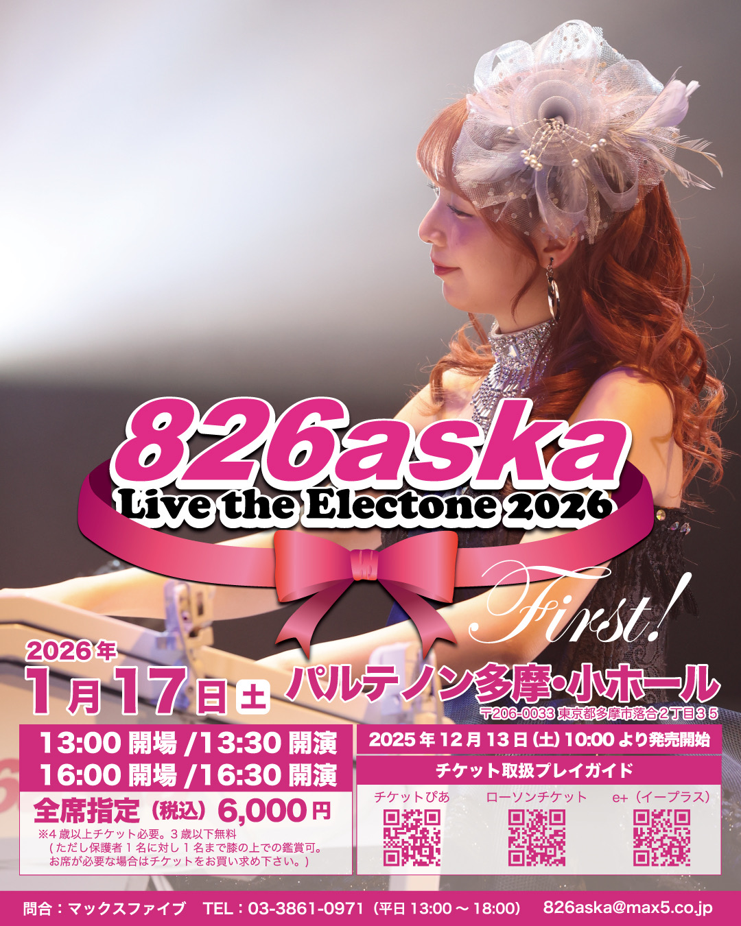 Home › 826aska › 826aska Live the Electone 2026 FIRST! 2025-12-16 826aska Live the Electone 2026 FIRST! 826askaの2026年最初のライブ開催決定です! 開催日は2026年1月17日(土)、会場は東京のパルテノン多摩です。 現在チケット大好評発売中! 詳細は画像にてご確認ください。 関連記事 826aska Live Tour Remember 追加公演決定! overflow vol.94 ハープ 宮本あゆみ 公演中止 来年2月11日(祝)大阪公演決定! 826aska Live the Electone2024in千葉・埼玉 4月12日(日)826aska エレクトーン LIVE 2020 826aska Christmas Live 2025 他2公演 826aska Valentine Live 2026 コメントを残す コメントをキャンセルメールアドレスが公開されることはありません。 ※ が付いている欄は必須項目ですコメント ※ 名前 ※ メール ※ サイト 次回のコメントで使用するためブラウザーに自分の名前、メールアドレス、サイトを保存する。 Δ